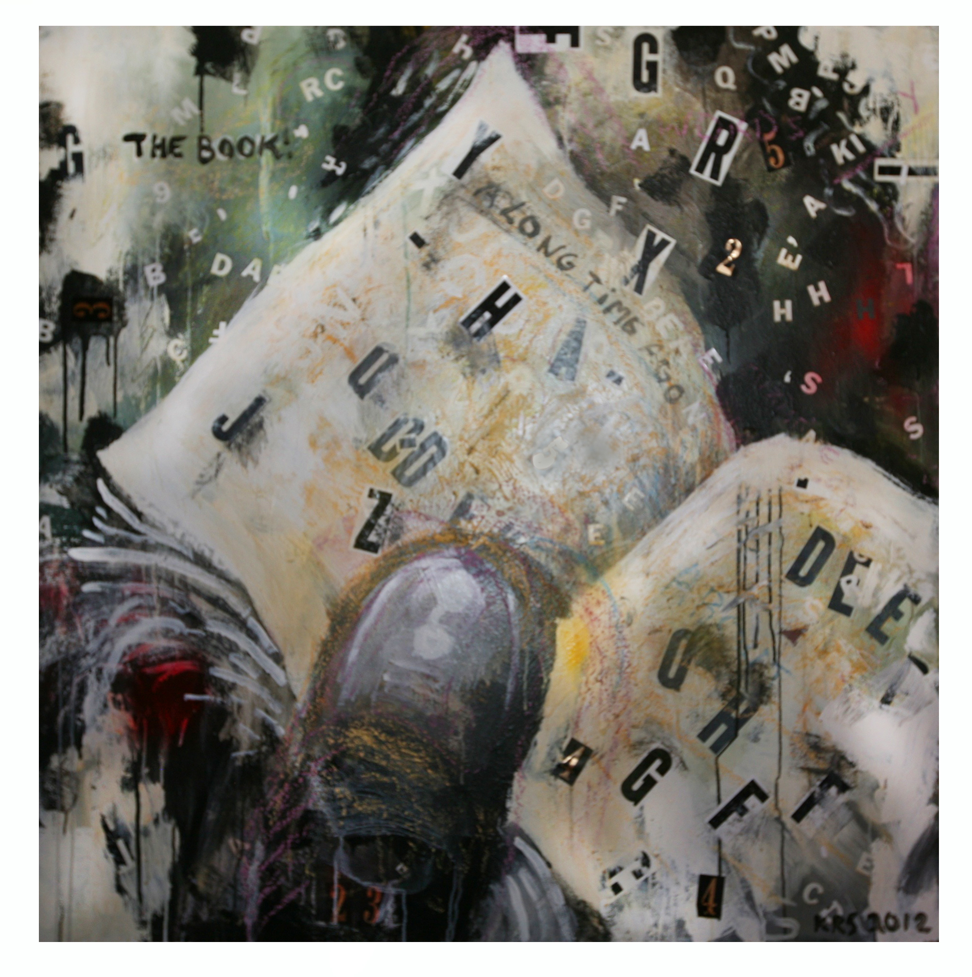 This painting was inspired by a friend of mine who is an avid reader and thinker and a short animated film we saw together called The Fantastic Flying Books of Mr. Morris Lessmore. I drew from the idea of the power of words and that they remain alive in all of our lives through reading and sharing. Growing up with Dyslexia in a family of readers and writers I struggled to find the love of reading. Later in life I was able to find a way to make reading and writing an important part of my life.