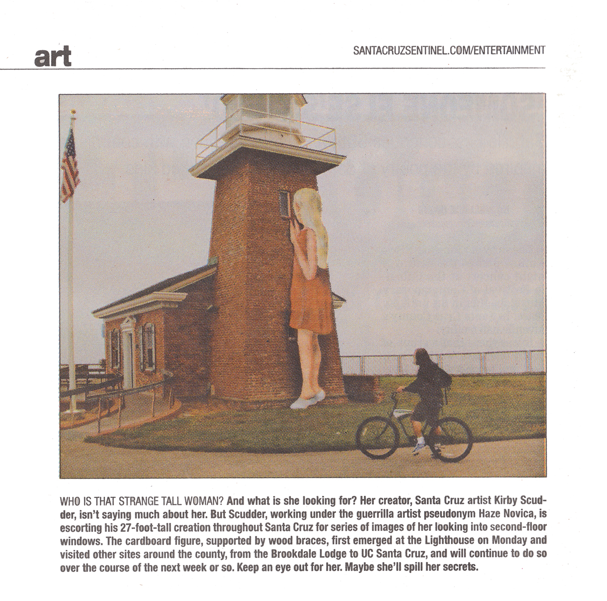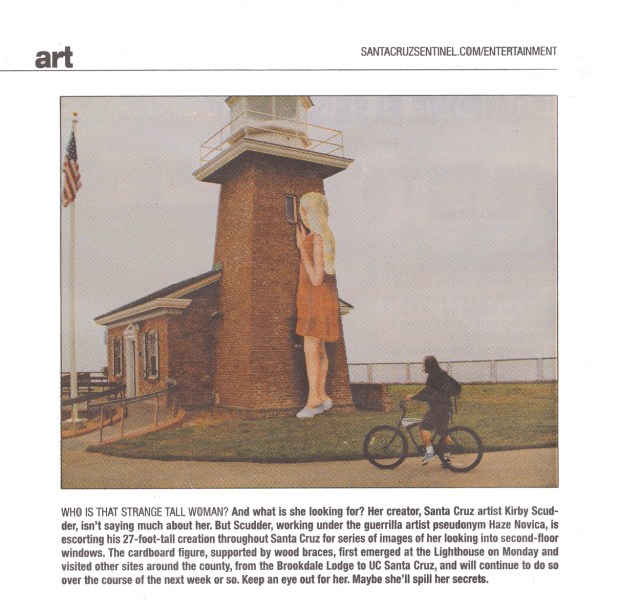 I created a fake artist name ‘Haze Novica’ and created a 27′ sculpture of a young girl with a great sense of curiosity who only wanted to peer in the second story windows of iconic Santa Cruz landmarks asking the question “what’s going on in there?” Myself and a friend drove her on the roof of a car throughout the county and propped her up when people weren’t looking into the upper stories of some very interesting places.