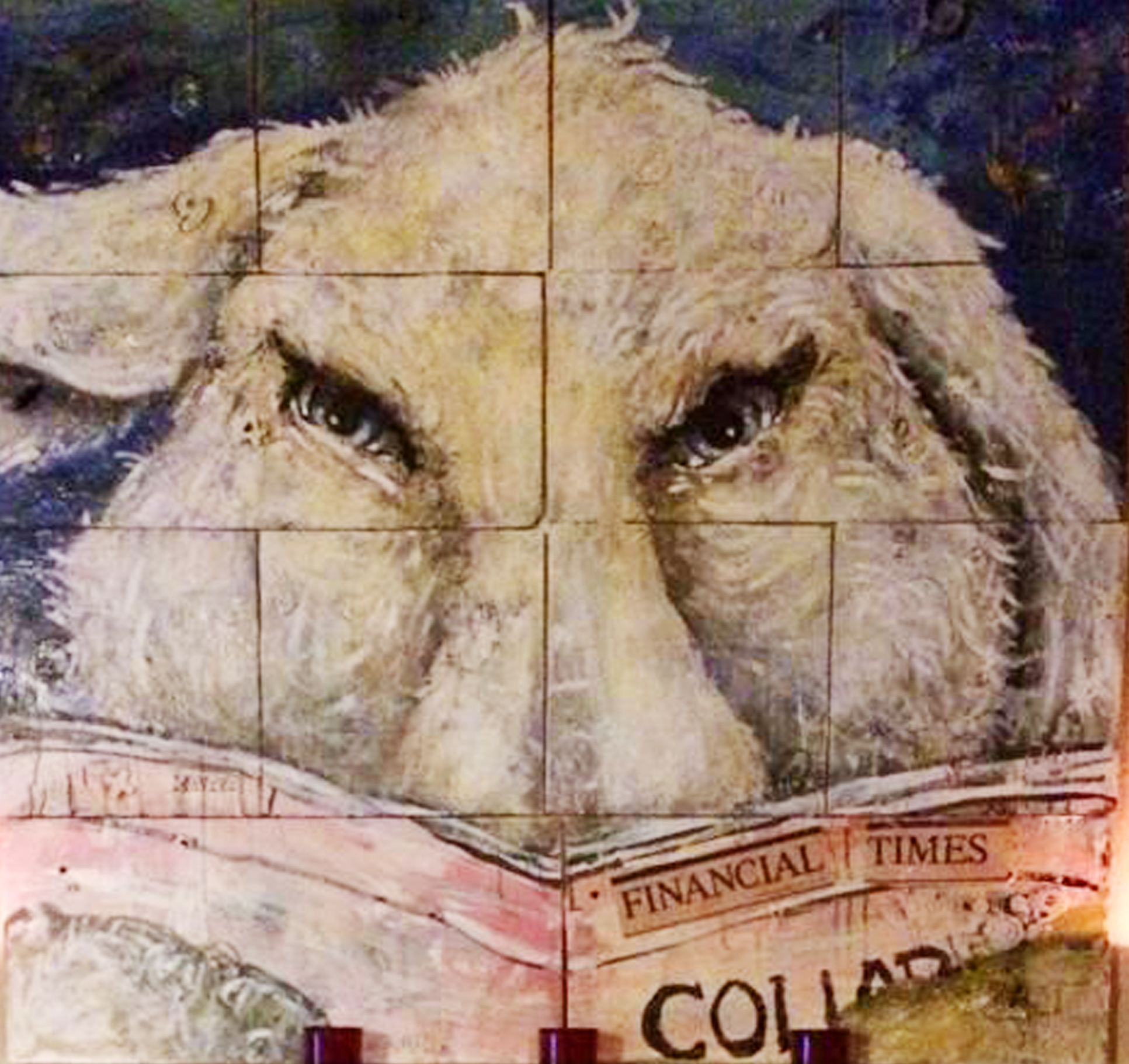 ‘English Hare, learning about the worldwide economic collapse in the Financial Times’ mixed media on wood.