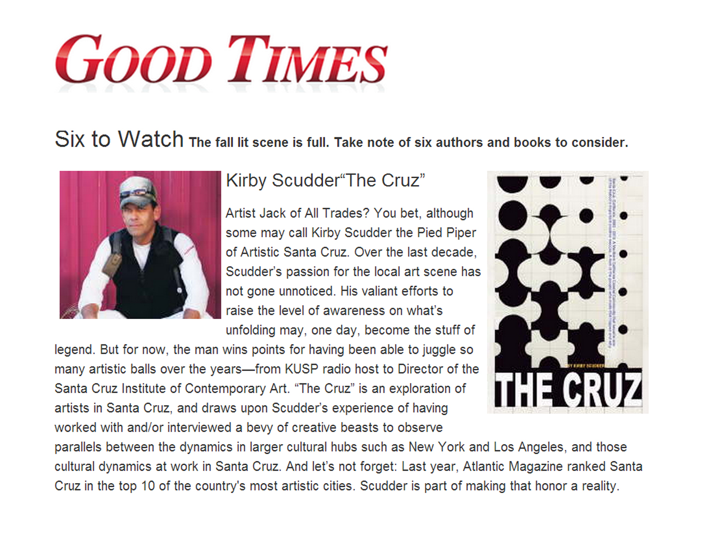 Since moving to Santa Cruz in 2003, Kirby Scudder has had the opportunity to interview hundreds of artists, arts organizers and arts advocates through his work as a radio host on KUSP Public Radio, columnist in the Santa Cruz Sentinel and Director of the Santa Cruz Institute of Contemporary Art. His exploration into the arts in Santa Cruz over this last decade, allowed Scudder to observe parallels between the dynamics in larger cultural hubs such as New York and Los Angeles, and those cultural dynamics at work in Santa Cruz. He noted that Santa Cruz’s investment in long term strategic projects attracted creative minds from around the country, all of whom are now helping to map out the cultural future of this community. In The Cruz’ readers gets to meet many of the people who make up the creative fabric of Santa Cruz and see why last year’s Atlantic Magazine ranked Santa Cruz in top 10 of the country’s most artistic cities.