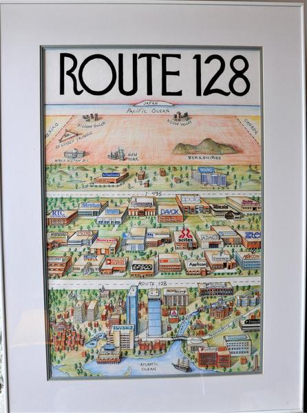 “Route 128, also known as the Yankee Division Highway (for the 26th Infantry Division), and originally the Circumferential Highway, is a partial beltway around Boston, Massachusetts, United States. The majority of the highway is built to freeway standards, and about 3/5 of it is part of the Interstate Highway System. With the rapid growth of high-technology industry in the suburban areas along Route 128 from the 1960s to the 1980s, Route 128 came to symbolize the Boston high-tech community itself. However, today the industry has expanded significantly onto Interstate 495 as well, the next beltway out.[2] In local culture, Route 128 is seen as something of a dividing line between the inner municipalities of Greater Boston and the more far-flung suburbs. The road’s roughly 10-mile (16 km) radius, for example, also delimits most of the area accessible by the MBTA rapid transit system. Much of the area within Route 128 was developed before World War II, while the area outside it was developed more recently. The south end of Route 128 is in Canton, where Interstate 95 heads south toward Providence, Rhode Island, just east of the Northeast Corridor’s Route 128 Station. Common usage, as well as signs until 1997, continues Route 128 east along the first 7 miles (11 km) of Interstate 93 to the Braintree Split in Braintree, where I-93 turns north with Route 3 toward downtown Boston. This section of former Route 128 serves as the north end of Route 24 to Fall River. (Until 1965, Route 128 continued further, southeast along Route 3 and roughly north on Route 228 to Hull.) 25 years afer being published the Route 128 Poster continues to draw interest from companies and organizations looking at dramatic changes in the tech markets over these many years. This year the Poster has been printed in publications 4 times and continues to discussed at conferences throughout the country.”