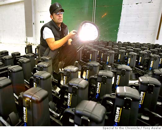 Santa Cruz artist Kirby Scudder checks one of 500 giant flashlights that he will set-up along a 3-mile stretch of West Cliff Drive in Santa Cruz on Thursday night as part of an art show and to commemorate International Peace Day. By Tony Avelar / SPECIAL TO THE CHRONICLE