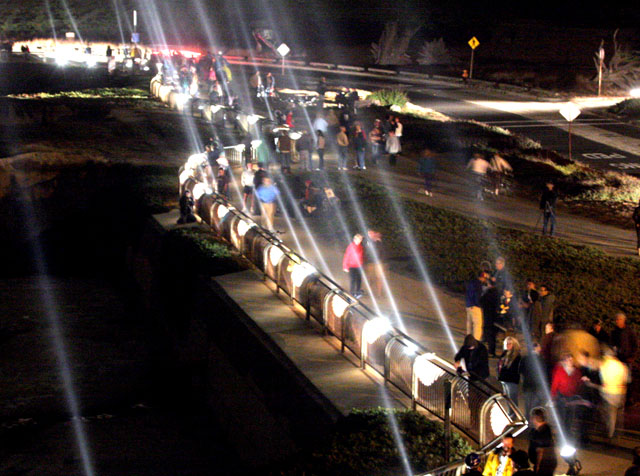 Battery-powered spotlights send beams skyward along three miles of coastline on Thursday night, Sept. 21, 2006, International Peace Day, in Santa Cruz, Calif. The event, to promote world peace, was organized by Kirby Scudder, an artist and co-director of the Santa Cruz Institute for Contemporary Art. (AP Photo/Santa Cruz Sentinel, Shmuel Thaler) ** MAGS OUT **