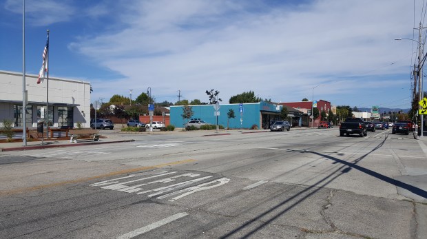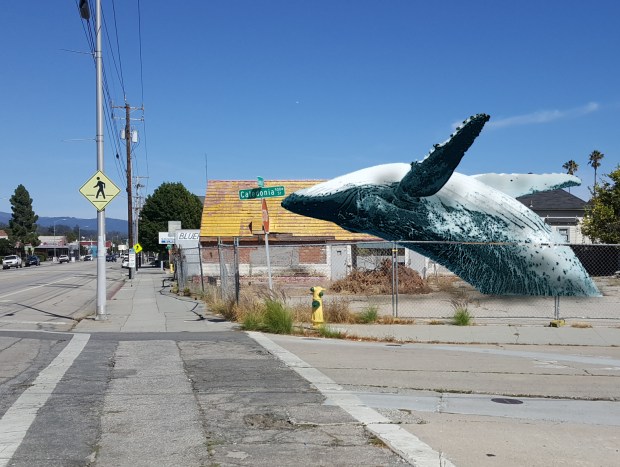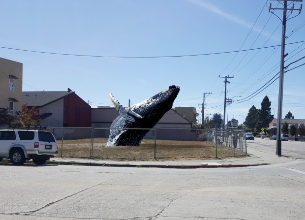 The corner of Cayuga and Soquel “Breaching Whale” temporary sculpture
