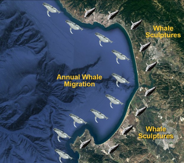 The Whale Project is a year long installation of 12 life size whale sculptures installed at temporary locations throughout locations around Monterey Bay.